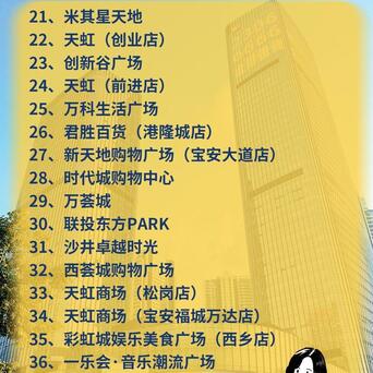 1、深圳前海壹方城 2、欢乐港湾 3、海雅缤纷城(宝安店) 4、宝安